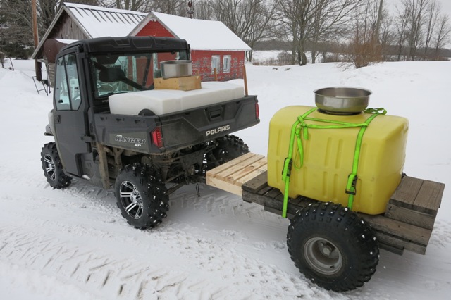 Greg and the Sap BuggyHere is Greg on his new toy – the Ranger.  He fitted the back of it with a new tank for added sap capacity.  He also added a platform on the sap trailer for the kids so they could dump sap into the tanks without help from the adults.  They will love it!  This added tank should help us avoid too many trips back to the sap cabin for dumping.